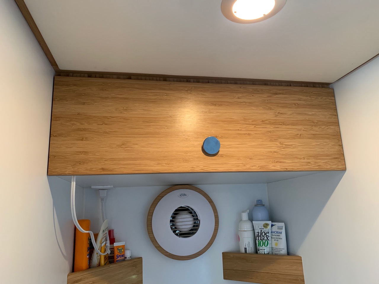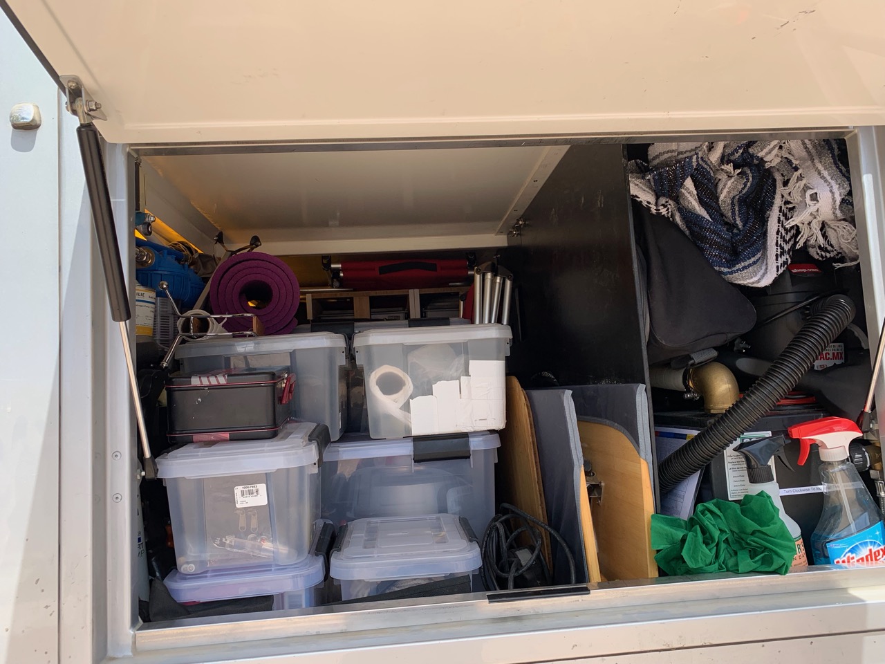 - Clothing (we’re each assigned two upper cabinets), hats, jackets